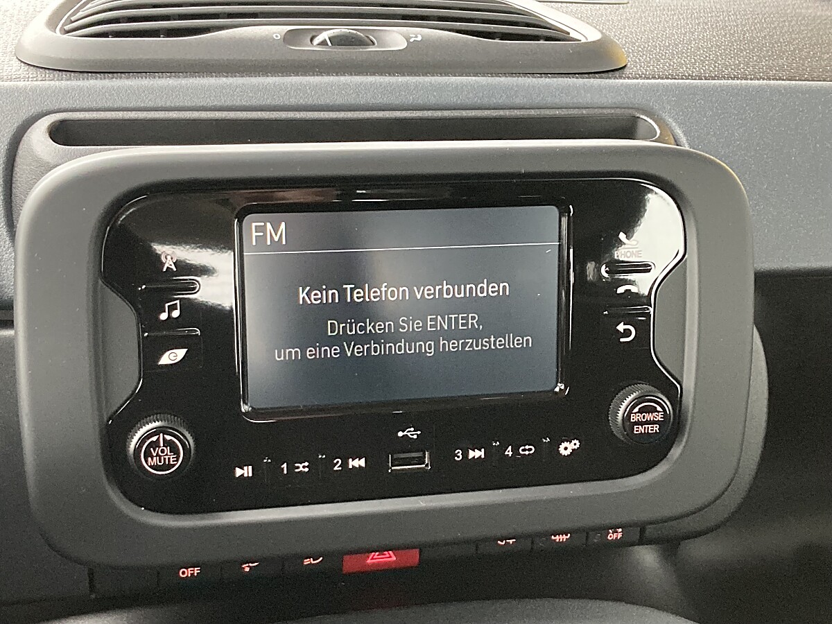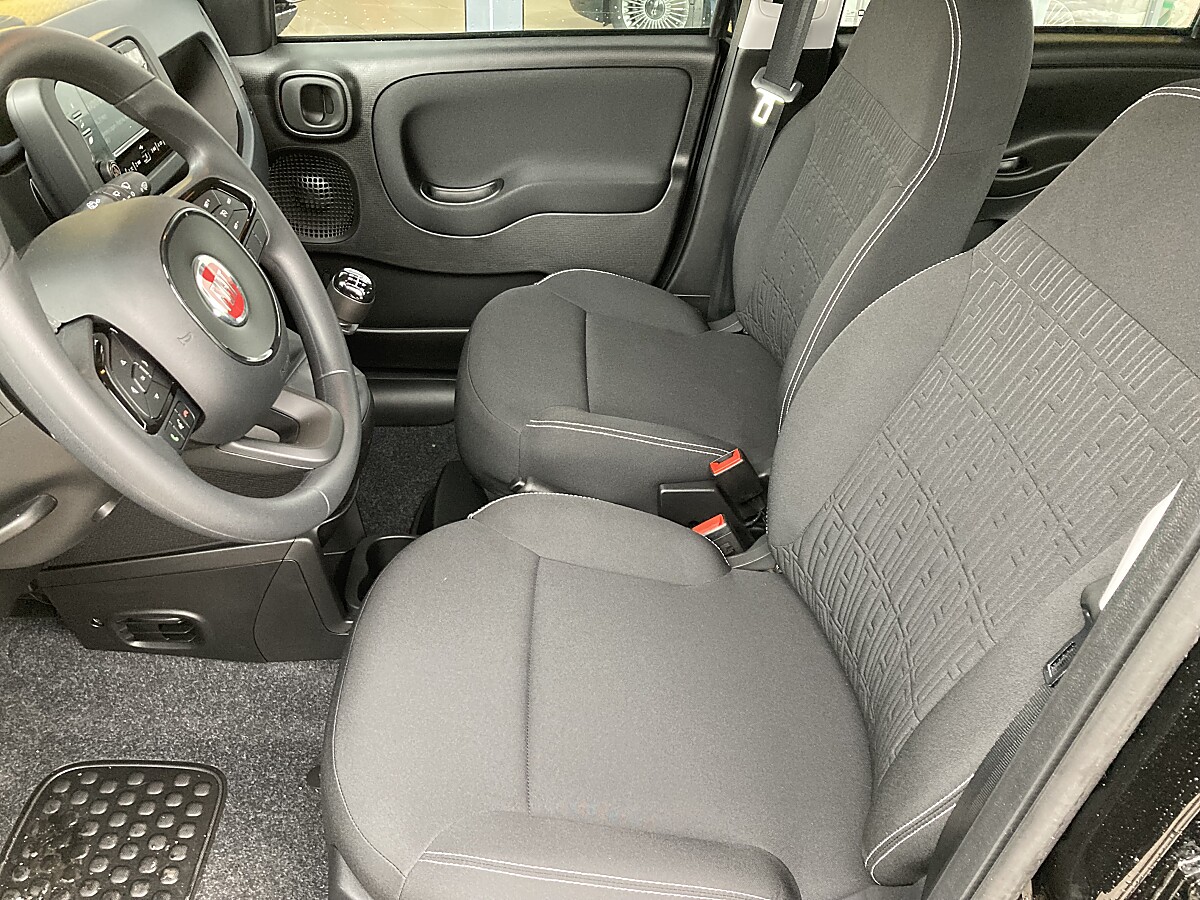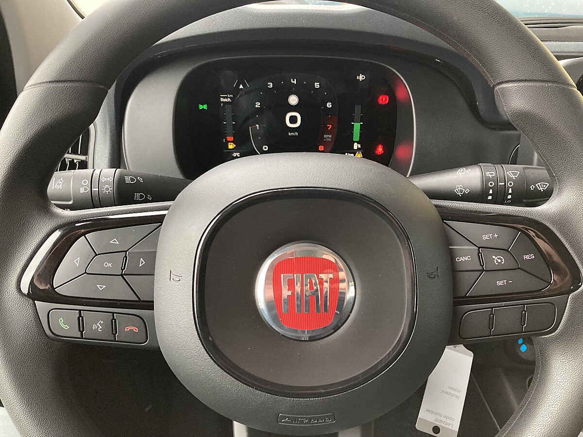Stoßfänger in Wagenfarbe mit schwarzem Fronteinsatz • 14″-Stahlfelgen mit silbernen Radkappen • Schwarze Spiegelkappen und Türgriffe • Armaturenbretteinlage in Anthrazit • Fahrersitz höhenverstellbar • Schwarze Stoffsitze mit „FIAT“-Monogramm • Aktive Kopfstützen vorne, höhenverstellbar• • Höhenverstellbares Lenkrad • Radio mit 5″-Bildschirm, DAB und Bluetooth • Audio-Bedienelemente am Lenkrad • Digitales Kombiinstrument • Manuelle Klimaanlage • Zentralverriegelung mit Funkfernbedienung • Start&Stopp-System • 3. Sitzplatz im Fond mit 3Punkt-Sicherheitsgurt inkl. 3 Kopfstützen für die hintere Sitzreihe • Isofix-Befestigung für Kindersitze an den hinteren Sitzen • Elektrische Fensterheber vorne • 12V-Steckdose vorne • Gurtanlegewarner • Reifendruckkontrollsystem • Elektrische Servolenkung Dualdrive • Electronic Stability Control (ESC) mit Hill Holder • ABS mit elektronischer Bremskraftverteilung (EBD) • Geschwindigkeitsregelanlage • Verkehrszeichenerkennung • Fahrspurhalte-Assistent • Erweiterte Notbremssysteme • Aufmerksamkeitsassistent • Parksensoren hinten • 6 Airbags
